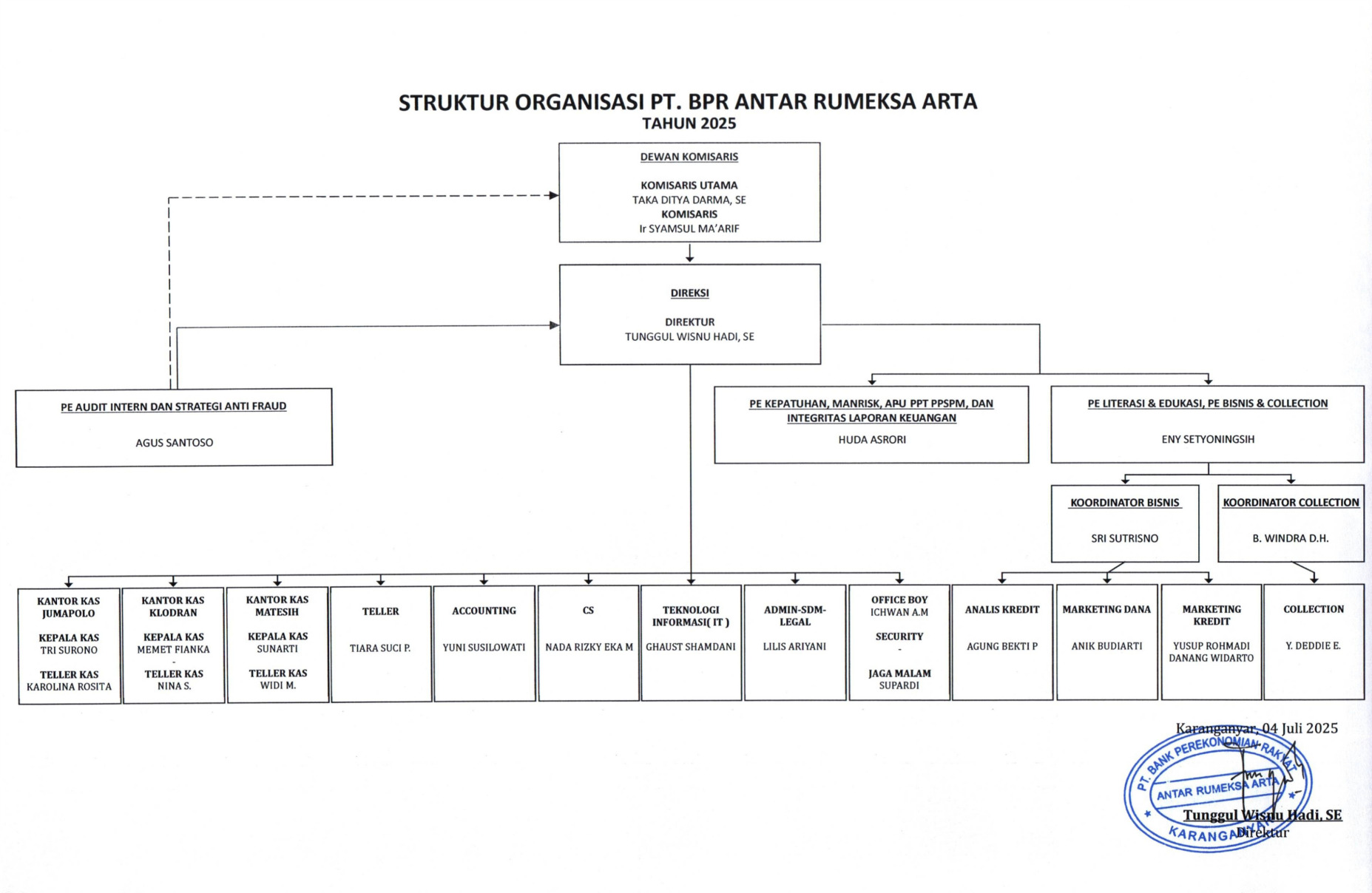 PT. BPR Antar Rumeksa Arta (dahulu bernama PT. Bank Perkreditan Antar Jaya Perdana) atau selanjutnya disebut “ BPR “ adalah perusahaan yang bergerak dalam bidang jasa keuangan (perbankan). Didirikan pada tanggal 14 Desember 1992 berdasarkan Akta No. 6 dari Agus Haryanto, SH, notaris di Karanganyar. Akta ini disahkan oleh Menteri Kehakiman Republik Indonesia dengan surat keputusan No. 02-2283 HT.01.01 Tahun 1993. Kantor mulai dibuka tanggal 22 Oktober 1993 di Kecamatan Jaten, Kabupaten Karanganyar, melihat perkembangan usahanya, pendiri membuatkan gedung baru di dukuh Kodokan Rt 01/01, Desa Papahan, Kecamatan Tasikmadu, Kabupaten Karanganyar. PT. BPR Antar Rumeksa Arta berkonsentrasi pada pelayanan masyarakat yang berdomisili dipedesaan dan sebagian besar merupakan golongan menengah kebawah, serta sebagian besar dari mereka belum terjangkau oleh pelayanan perbankan. Dengan menyediakan pelayanan jasa perbankan diharapkan bisa membawa pengaruh yang positif bagi peningkatan perekonomian masyarakat pedesaan dan daerah.